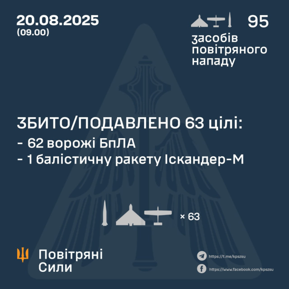 У ніч проти 20 серпня противник атакував Україну двома балістичними ракетами “Іскандер-М”, а також та 93-ма ударними БпЛА типу Shahed і безпілотниками-імітаторами різних типів.
